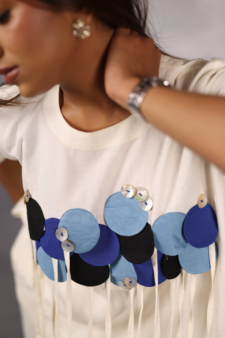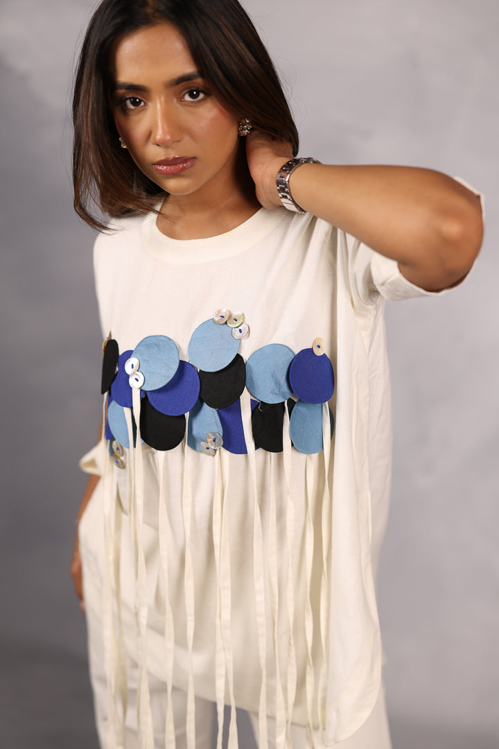 Soft minimalism defines this ivory cotton co-ord set, elevated through handcrafted appliqué detailing. Delicate textures rest against a clean silhouette, creating visual interest without overwhelming the form. The gentle flow adds comfort with sophistication.